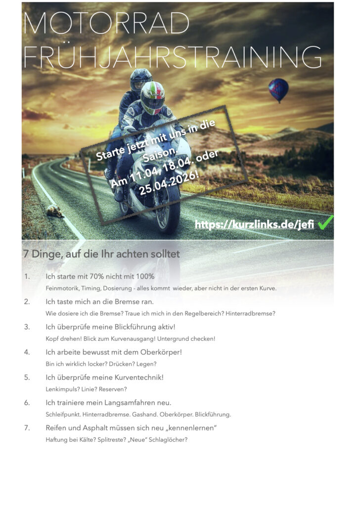 Hallo Ihr Lieben, wir versuchen mal wieder ein Motorrad Frühjahrstraining auf die Beine zu stellen, wenn Ihr Interesse habt, tragt Euch bitte bei Doodle (einfach Motorrad Frühjahrstraining klicken und los gehts) zu einem der Termine ein.